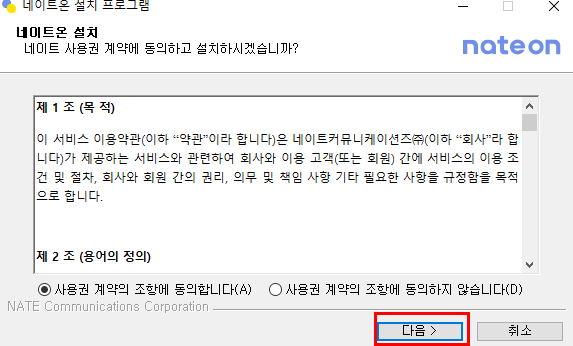 네이트온 설치 파일을 다운로드한 후 실행하고 다음 > 버튼을 클릭합니다.